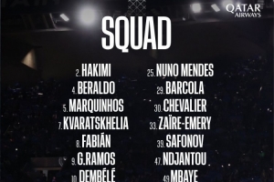 巴黎對陣拜仁大名單:登貝萊、阿什拉夫領(lǐng)銜,扎巴爾尼、杜埃缺席
