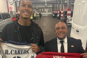 體育資訊11月5日訊 在利物浦結束與皇馬的歐冠較量后,紅軍隊長維范戴克在社交媒體上曬出與皇馬傳奇左后衛羅伯托-卡洛斯的合影,兩人并互換了球衣。