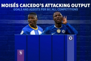 體育資訊11月5日訊 本賽季凱塞多在進攻端發揮越來越好,德轉也盤點了球員生涯每90分鐘參與進球數據(各項賽事進球+助攻),其中來到英超后逐年遞增,具體如下: