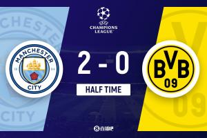 上半場補時2分鐘。半場戰罷,曼城2-0多特。