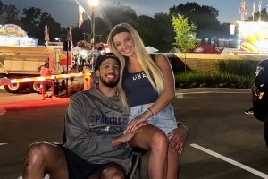 體育資訊7月5日訊 當地時間7月4日是美國獨立日,哈利伯頓和女友Jade在室外觀看煙花秀慶祝節日。