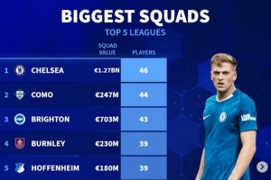 體育資訊7月8日訊 《轉(zhuǎn)會(huì)市場(chǎng)》統(tǒng)計(jì)了當(dāng)前五大聯(lián)賽一線隊(duì)人數(shù)最多的球隊(duì)情況,切爾西無懸念居首。
