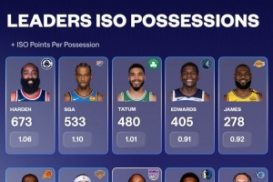 其中哈登單打回合數673次斷檔領先,亞歷山大533次排在第二,第三的則是塔圖姆480次。單打回合數4-10名的球員分別是:愛德華茲、詹姆斯、杜蘭特、布倫森、德羅贊、歐文、班凱羅。(注:單打回合數、單打每回合平均得分如圖)