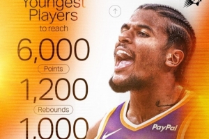 體育資訊7月11日訊 太陽官方曬出一張關于“拿到6000分+1200籃板+1000助攻最年輕的8位球員”數據圖,并配文寫到:“躋身頂級行列。”