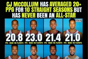 CJ在個人最近的連續10個賽季中場均得分20+,但卻從來沒有進入過全明星,而同期達成此成就的僅有7人:詹姆斯、庫里、歐文、濃眉、德羅贊、杜蘭特、利拉德。