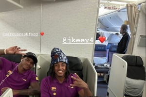 巴德吉隨巴薩前往日本,開啟亞洲行,他在社交媒體上曬出飛機內的照片,坐在他身后的是孔德和拉什福德。