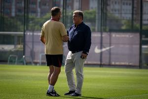 訓練在當地時間下午6點開始,巴薩主席拉波爾塔到達現場,陪同他的還有第一副主席拉法-尤斯特、高管恩里克-馬西普和亞歷杭德羅-埃切瓦里亞。