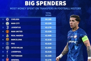 體育資訊7月29日訊 《轉會市場》統計了歷史轉會費支出情況,切爾西獨自領跑,前11名中英超獨占6席。