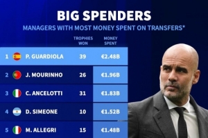 體育資訊7月30日訊 《轉會市場》統(tǒng)計了主教練生涯轉會費支出榜,瓜帥無懸念居首。