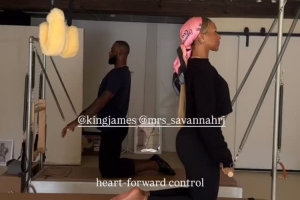 薩瓦娜轉發了一位位于洛杉磯的普拉提教練的動態,后者曬出了她指導詹姆斯夫婦練習普拉提的片段。