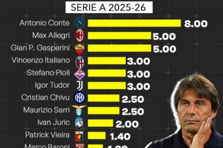 體育資訊08月06日訊 近日,意大利金融媒體Calcio e Finanza統計了25-26賽季意甲各隊主帥的年薪排行。
