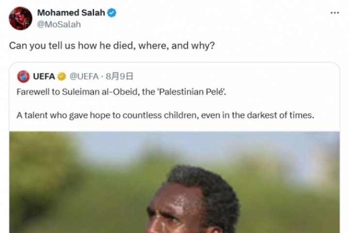 體育資訊08月10日訊 歐足聯(lián)官方此前發(fā)文,向不幸喪生的巴勒斯坦球星奧貝德簡短致哀。利物浦球星薩拉赫轉(zhuǎn)發(fā)了這則帖文,并發(fā)出了三個疑問。