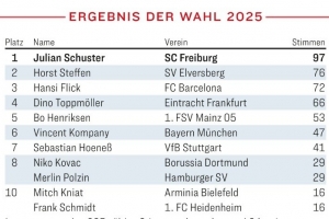 體育資訊8月11日訊 弗賴堡主帥舒斯特爾當選2025年德國最佳教練,《踢球者》公布得票詳情,舒斯特爾97票居首,斯蒂芬、弗里克二三位。