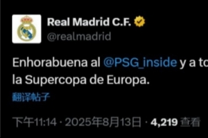 皇馬官方寫道:“祝賀巴黎圣日爾曼以及其所有的球迷,恭喜你們贏得實至名歸的歐洲超級杯冠軍。”