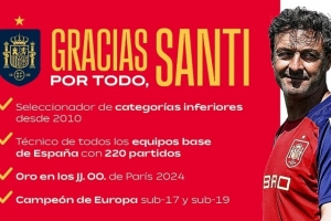 在執教西班牙各級國家隊的220場比賽中(10場U15、16場U16、105場U17、14場U28、39場U19、30場U21和6場奧國奧),桑蒂為西班牙足球做出了巨大貢獻。西班牙足協全體員工對他的付出表示衷心感謝,并祝愿他在新的職業生涯中一切順利。