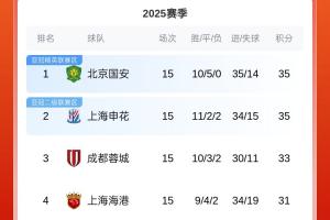 體育資訊06月26日訊 中超第15輪結束,賽季正式過半,積分榜情況如下