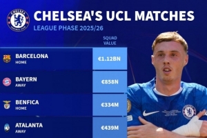 體育資訊8月29日訊 本賽季歐冠聯(lián)賽階段對陣抽簽結(jié)果出爐,德國轉(zhuǎn)會市場盤點(diǎn)了切爾西對手的身價。