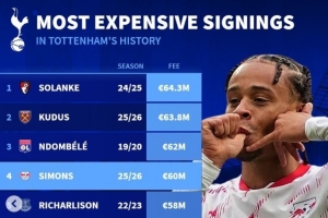 據德轉數據統計,6000萬歐簽下西蒙斯是熱刺隊史第四貴引援。