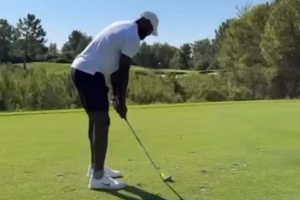 詹姆斯曬與友人冒著102華氏度(38.9攝氏度)高溫練習打高爾夫的一系列動態(tài)及合影。