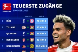 體育資訊9月4日訊 德甲夏窗已經截止,《轉會市場》也統計了德甲今夏的最貴引援榜,路易斯-迪亞斯斷崖領跑。