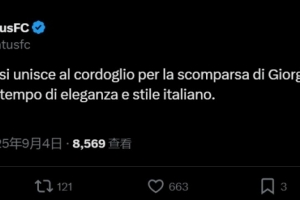 尤文官方寫道:“尤文圖斯俱樂部對喬治-阿瑪尼的逝世表示哀悼,他是意大利優雅與風格的永恒象征。”