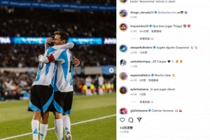 蒂亞戈-阿爾馬達在賽后也曬出他和梅西的相擁慶祝照,并艾特了阿根廷國家隊官方社媒:“????????”