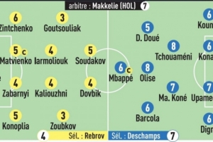 法國首發:邁尼昂6分、迪涅6分、于帕梅卡諾7分、科納特6分、孔德6分、瓊阿梅尼8分、科內7分、巴爾科拉6分、杜埃5分、奧利塞8分、姆巴佩6分
