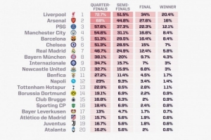 體育資訊9月10日訊 opta使用超級計算機預測本賽季歐冠奪冠概率,利物浦20.4%為奪冠最大熱門,阿森納16%次席,巴黎12.1%第三。