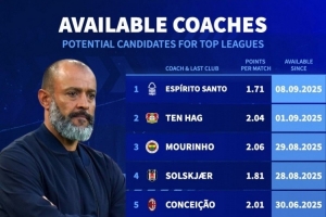 體育資訊9月10日訊 德國轉會市場盤點了目前賦閑的教練,穆里尼奧、滕哈赫、哈維、努諾在列。