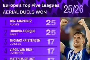體育資訊9月12日訊 Squawka統計了本賽季球員在五大聯賽的爭頂成功次數,并列出榜單。