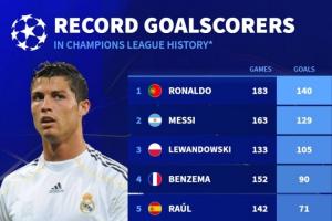 體育資訊09月16日訊 今夜,新賽季歐冠就將打響。德轉在賽前列出了歐冠歷史射手榜,C羅以140球位列榜首,梅西129位列第二,萊萬105球第三。