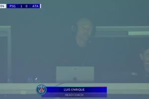 比賽第23分鐘,轉播鏡頭給到巴黎主帥恩里克,他出現在看臺上,頭戴耳機指揮著球隊。