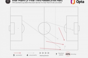 值得一提的是,邁阿密國際全隊上半場共計在進攻三區傳球7次,其中3次成功。