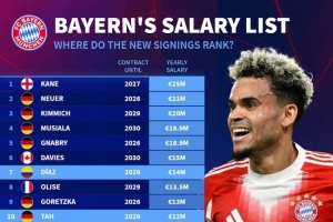 體育資訊9月20日訊 德國轉會市場列出了拜仁球員的年薪榜單,凱恩2500萬歐居首,諾伊爾2100萬歐次席,杰克遜600萬歐。
