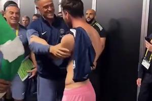賽后在球員通道,梅西與恩里克、多納魯馬、金彭貝等人擁抱攀談。
