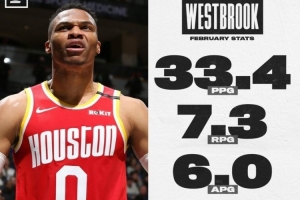 接著NBA Memes曬出了2020年2月搭伙哈登時的威少的月數據,場均33.4分7.3板6助攻,投籃命中率為54.9%。