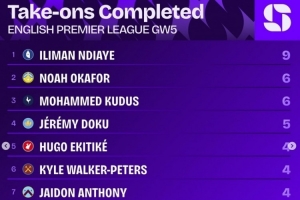 體育資訊9月24日訊 英超第5輪戰罷,squawkafootball列各項數據排行,埃弗頓邊鋒恩迪亞耶是完成過人最多的球員,共9次。