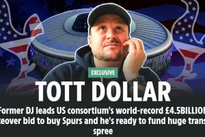 體育資訊09月26日訊 太陽報獨家報道,一家美國財團計劃以創世界紀錄的45億英鎊總報價買托特納姆熱刺。