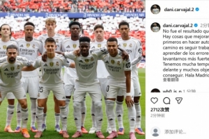 本場比賽受傷的卡瓦哈爾也在社媒曬出全隊合影鼓勵球隊,配文寫道:“這不是我們想要的結果。我們需要改進的地方還有很多,我們首先要進行自我反省。接下來的路就是繼續努力,從錯誤中學習,并以更強的姿態重新站起來。賽季還很漫長,還有很多目標需要實現。Hala Madrid! ”