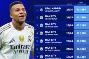 歐冠歷史身價差距最大比賽排行↓(本賽季阿森納對陣凱拉特交鋒也將躋身榜單,但由于球員身價將在后續更新中調整,故暫未列入本次統計)