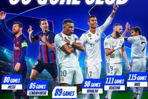 歐冠官方也盤點了歷史上打進歐冠60球最快用時場次榜,具體如下:
