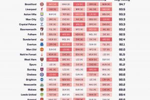 緊隨其后的是利物浦,其對手平均評分為93.5。紅軍將先后客場挑戰切爾西、主場迎戰曼聯、客場對陣布倫特福德、主場迎戰維拉,最后客場對陣曼城。