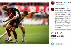 穆勒社媒曬出比賽照片,配文:“世俱杯對陣弗拉門戈是一場激動人心的比賽,4-2獲勝之后,我們將在1/4決賽中對陣巴黎。”