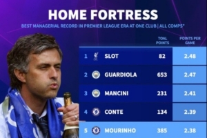 體育資訊10月3日訊 根據德轉統計,在英超執教單一俱樂部各項賽事主場場均得分榜上,斯洛特位列第一,瓜迪奧拉第二,穆里尼奧第五,弗格森第六。