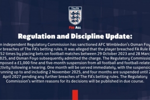 獨立監管委員會已對AFC溫布爾登球員奧斯曼-福約違反博彩條例的行為作出處罰。據指控,該球員在2023年10月29日至2025年3月28日期間對足球比賽進行投注,違反英足總E8條例252次。