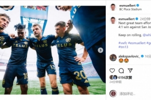 穆勒社媒曬出與隊友的合照,配文:“又一場出色的團隊表現,4-1擊敗圣何塞。繼續前進,溫哥華白浪!”
