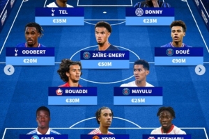中場(chǎng):布阿迪(里爾,3000萬歐)、馬尤盧(巴黎,5000萬歐)、奧多貝爾(熱刺,2000萬歐)、扎伊爾-埃梅里(巴黎,5000萬歐)、杜埃(巴黎,9000萬歐)