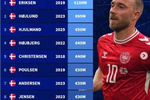 體育資訊10月13日訊 德轉統計了丹麥球員歷史身價榜,埃里克森1億歐位列第一。