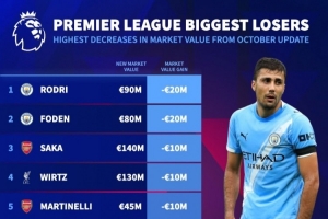 體育資訊10月17日訊 德轉統計了最新的英超球員身價跌幅榜單,曼城中場羅德里和福登身價均下降2000萬歐元,分列前二,阿森納四人上榜。