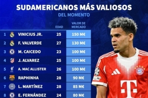 體育資訊10月18日訊 德國轉會市場更新了部分球員的身價,并列出南美球員德轉身價排名,維尼修斯、巴爾韋德排名前兩位。